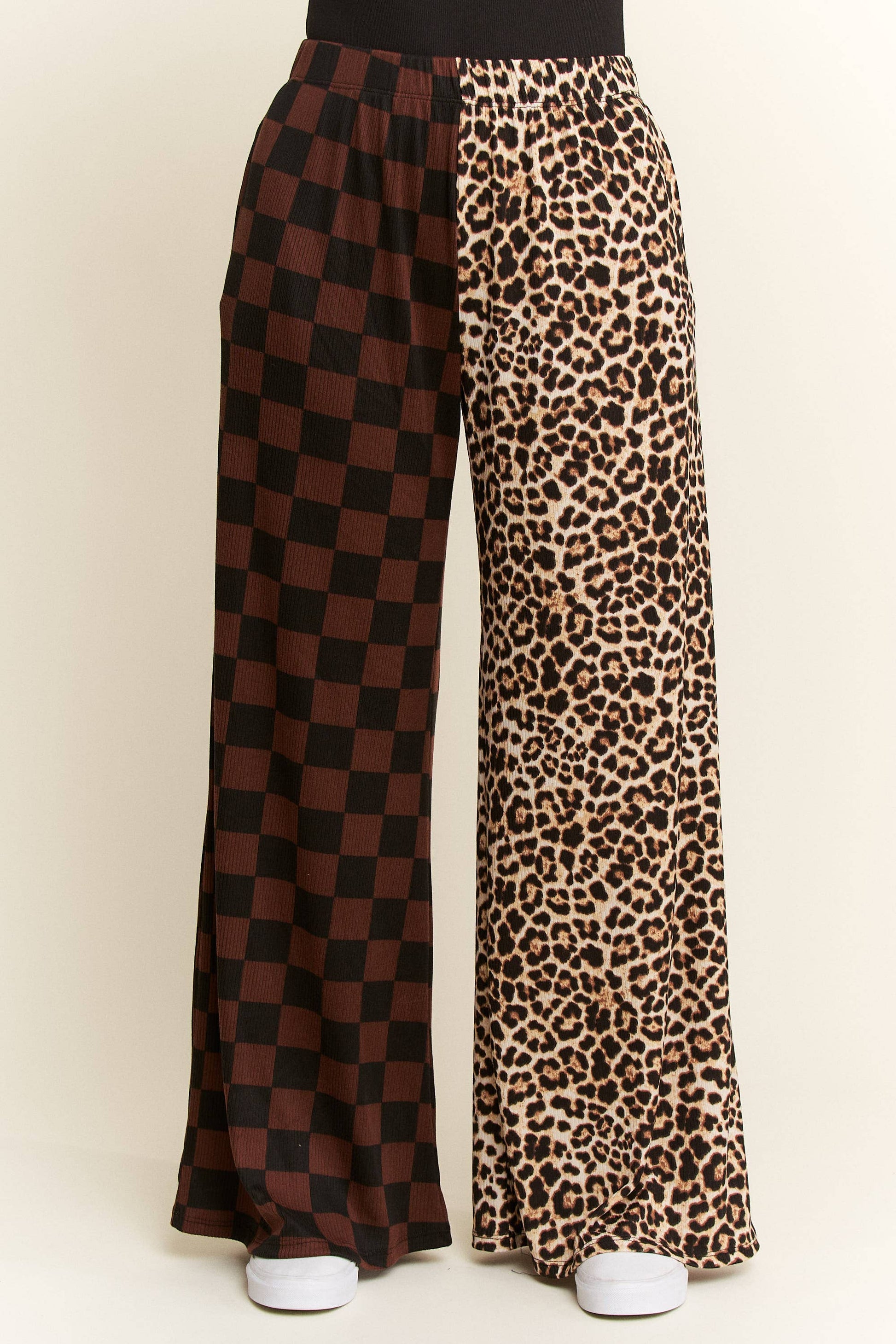 SPLIT DECISION LEOPARD-CHECKERED PANTS - Ribbed material - Soft, stretchy - Elastic waistband - Pockets - Slightly flared bottom - Full length - Double print